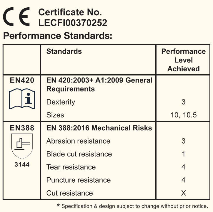 • CE Comformity with abrasion, blade cut, tear, puncture and cut resistance